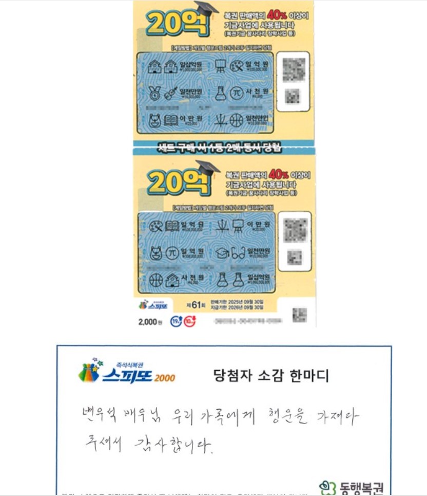 스피또2000 1등 당첨, 변우석 배우 꿈 덕분에 20억 행운..