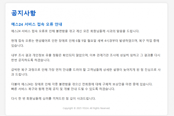 YES24가 랜섬웨어에 감염된 사실을 결국 발표함