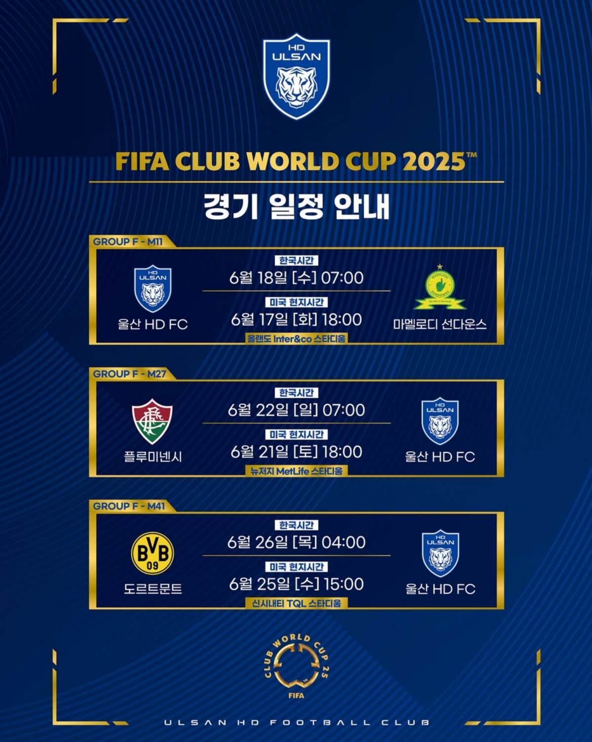 울산은 이번 대회 F조에 편성돼 있다. 조별리그에서는 마멜로디 선다운스(남아공), 플루미넨시(브라질), 도르트문트(독일)와 차례로 맞붙는다.