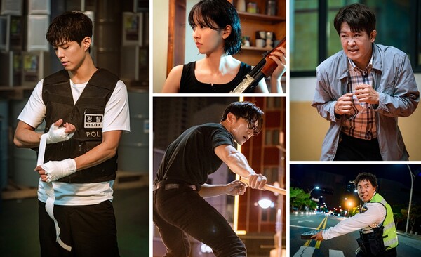 먼저, 핸드랩을 감는 ‘윤동주’(박보검)의 진지한 표정은 빌런 퇴치를 향한 그의 불꽃 같은 의지를 고스란히 보여준다. 이어, 검 대신 나무 막대를 들고 대치 중인 ‘김종현’(이상이)과 주먹을 꽉 쥔 채 금방이라도 돌진할 듯한 ‘고만식’(허성태)의 모습은 팽팽한 긴장감을 불러일으킨다. 뿐만 아니라, 결연한 표정의 총을 든 ‘지한나’(김소현)와 맨홀 뚜껑을 던지기 일보 직전의 ‘신재홍’(태원석) 또한 각자의 종목에서 최고의 자리에 오른 영웅들이었음을 여실히 보여준다.