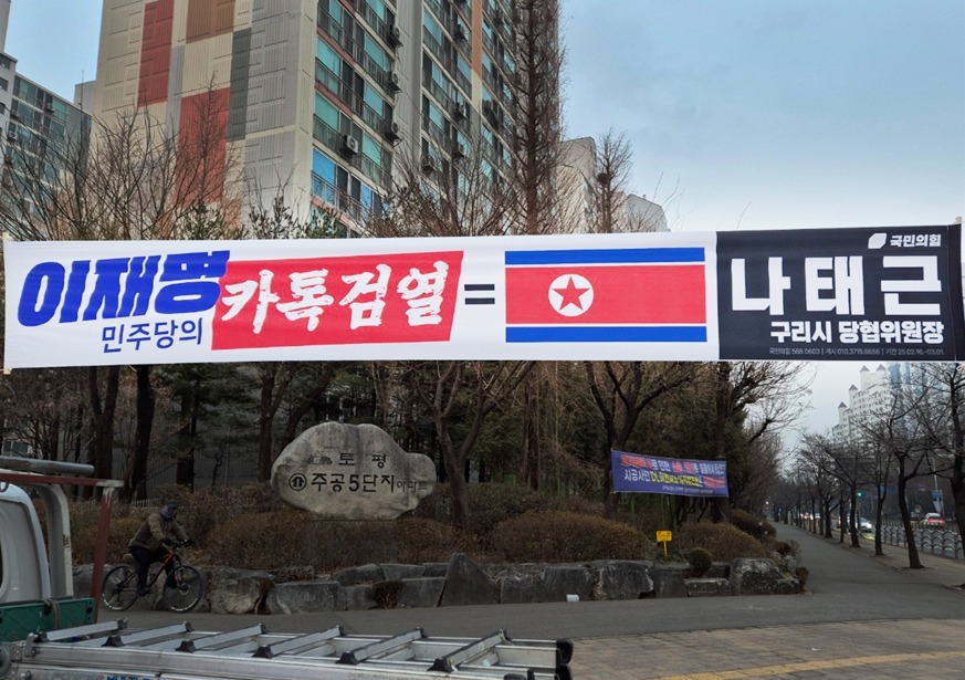 나 위원장은 지난 2월 자신이 구리시 곳곳에 게시한 '이재명 민주당의 카톡 검열=북한 인공기'이라는 현수막으로 인해 더불어민주당으로부터 허위사실 적시 혐의로 고발당한 사건을 언급했다.