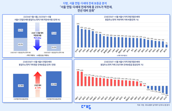 다방 관계자는 “지난 2023년부터 서울 연립·다세대의 역전세 거래를 지속 분석해 온 결과, 전세 시장에서 여전히 역전세 현상이 나타나고 있으나 거래 비중은 작년보다 다소 줄어든 것을 확인할 수 있었다”라며 “지역에 따라 역전세 비중이나 전세가 하락폭에 차이가 있는 만큼 향후 전세 시장 흐름을 면밀히 살펴봐야 할 시점”이라고 전했다.