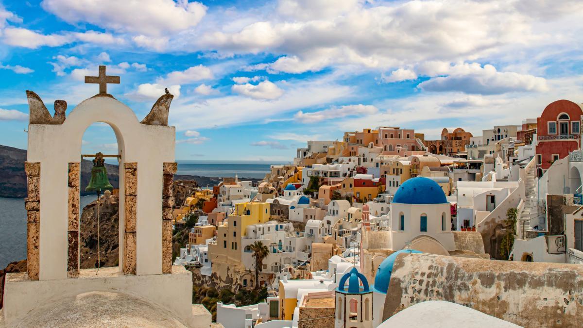 과거 대규모 화산 폭발로 인해 현재의 독특한 말굽 모양을 이루었다고 알려졌으며, 깎아지른 절벽 위에 하얀색 벽과 파란 돔을 가진 건물들이 장관을 이룬다.