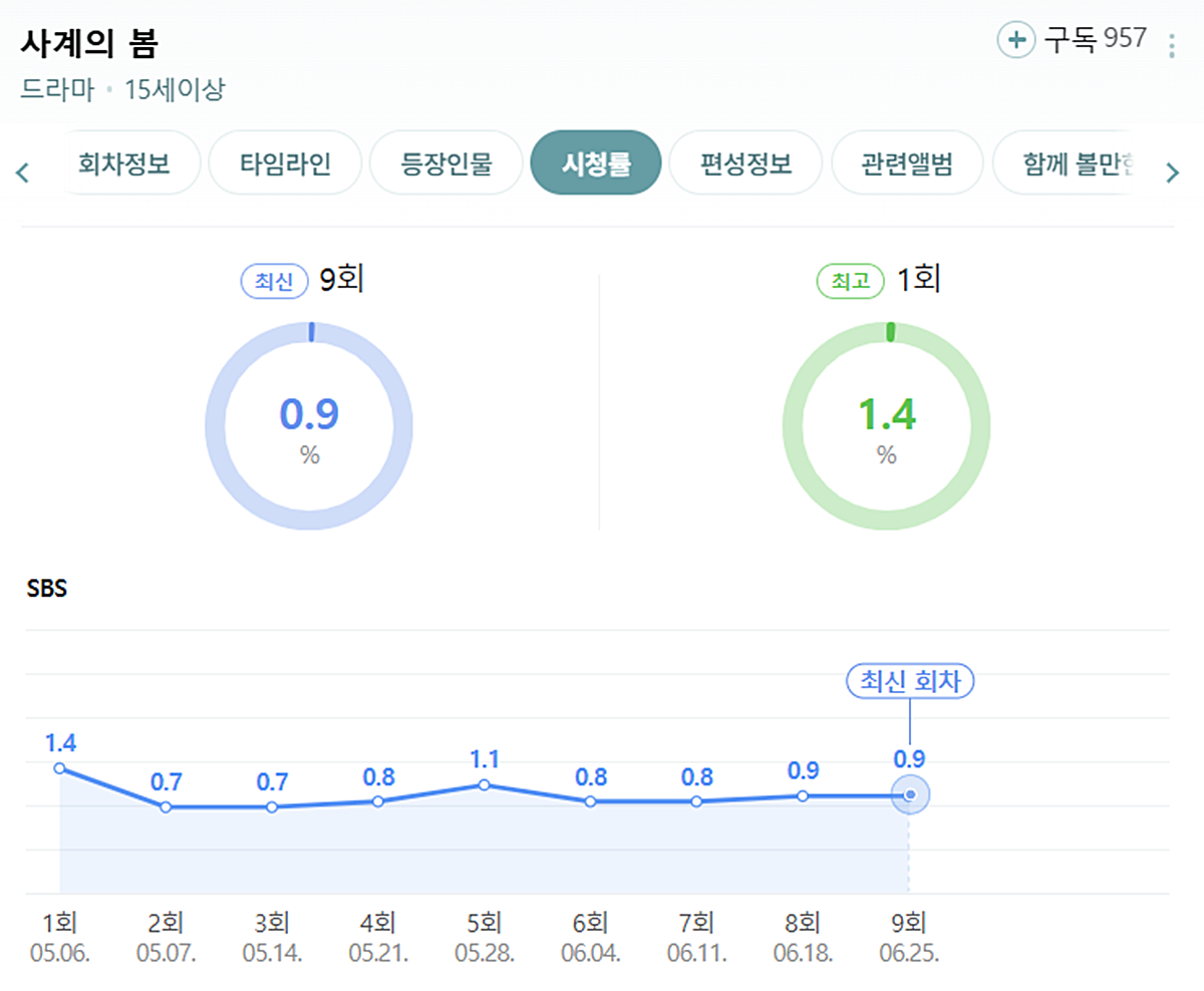 SBS 수요드라마 ‘사계의 봄’이 종영을 단 1회 남겨둔 가운데, 9회까지 4회 연속 시청률 0%대를 기록하며 끝내 반등에 실패했다. 25일 방송된 9회는 반전과 감정선이 폭발한 회차였음에도 불구하고 저조한 성적에서 벗어나지 못하며, 시청률 부진 속에서 쓸쓸한 마무리를 예고했다.