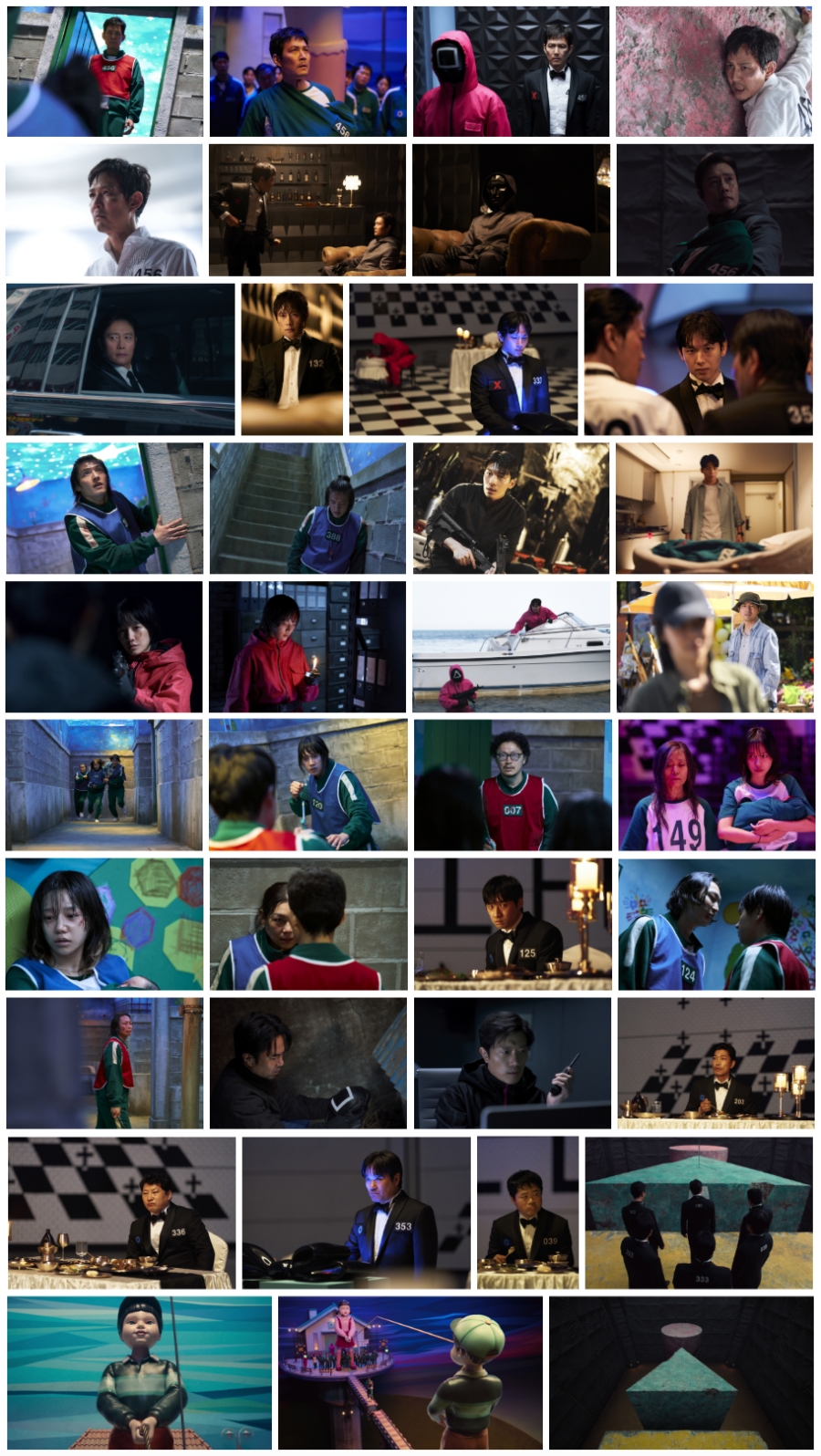 베일을 벗은 미공개 스틸은 게임에 참여한 참가자들의 마지막 모습과 게임이 끝난 후 일상으로 돌아간 인물들의 다채로운 모습들을 포착하고 있다. ‘기훈’(이정재)이 ‘고공 오징어 게임’ 외벽에 힘겹게 매달려 있는 모습은 생사의 갈림길 앞에서도 누군가를 구하기 위해 애쓰는 그의 인간적인 면모를 생생하게 담아낸다. 아기를 안고 있는 ‘프론트맨’(이병헌)의 모습은 결말을 향해 달려가는 이야기에 궁금증을 증폭시키며, 132번 참가자로 게임에 참가했던 과거 ‘프론트맨’의 모습 또한 보여주며 그의 서사에 몰입감을 더한다. 살아남기 위해 이기적인 선택을 이어갔던 ‘명기’(임시완)의 날카로운 표정과 두려움에 사로잡힌 ‘대호’(강하늘)의 모습은 손에 땀을 쥐게 하는 긴장감을 전하며, 게임섬과 형 ‘인호’를 찾기 위해 치열하게 달려온 ‘준호’(위하준)가 아기 요람을 바라보는 모습은 뜻밖의 장면으로 시청자들에게 놀라움을 안긴다.