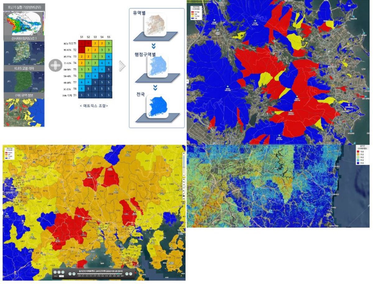 ‘실시간 산사태 위험도’는 산사태 예·경보 시스템(KLES: Korea Landslide Early-warning System)에서 수집한 실시간 강우량 정보를 기반으로 분석한 토양 내 물 양과 산사태 위험도 지도를 결합해 산사태 발생 가능성이 높은 지역을 실시간으로 표출한다.