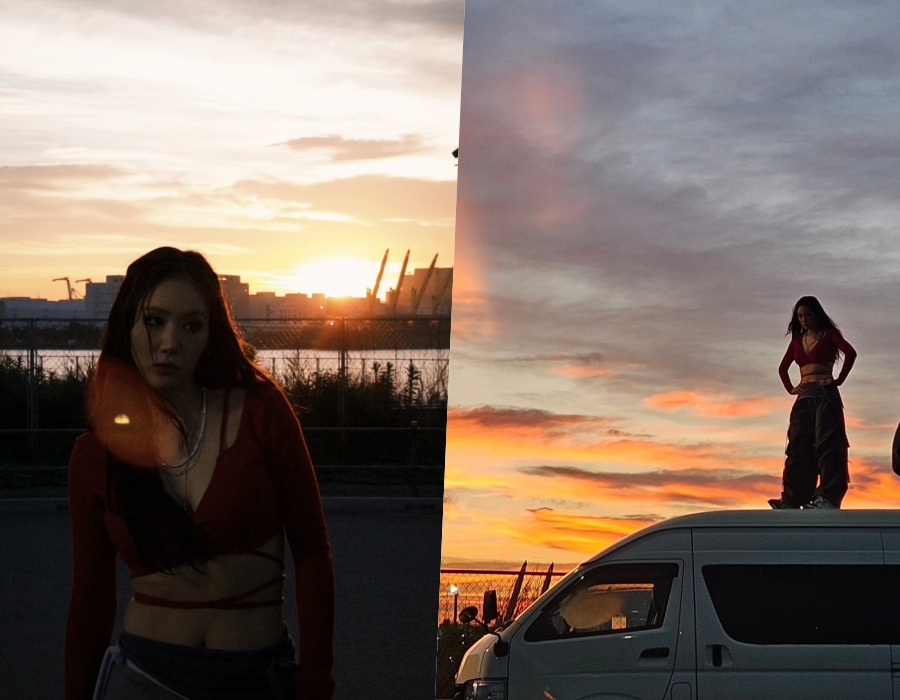 특히 허리 라인을 따라 감긴 얇은 끈 디테일이 유니크한 매력을 더했고, 자연스럽게 흘러내린 웨이브 헤어와 실버 액세서리들이 전체 룩에 카리스마를 불어넣는다. 해질녘 붉게 물든 하늘 아래 차 위에 올라선 소유의 실루엣은 그 자체로 한 장의 영화 포스터를 연상케 한다.