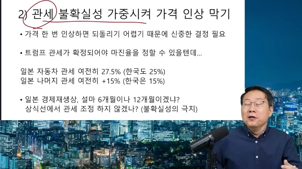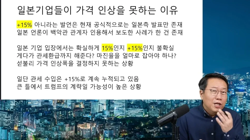 관세를 추가 15%라고 했다가, 다시 최종적으로 15%라고 했다가, 게다가 관세를 환급까지 해준다고 하니 일본 기업은 마진을 계산할 수가 없는 상황이 되었다.