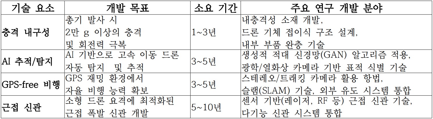 드론 요격 및 자폭 공격에 최적화된 근접 신관 기술을 적용하고, 드론 떼 공격에 대응하기 위한 동시 다수 운용 시스템 및 지휘 통제 체계를 통합한다.