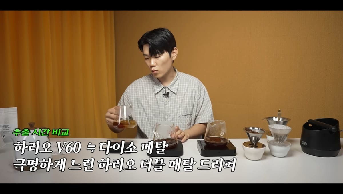 그는 이날 다이소 커피 드리퍼와 하리오 더블 메탈 드리퍼, 종이필터를 사용해야 하는 하리오 드리퍼 V60을 블라인드 테스트해 보기로 했다.