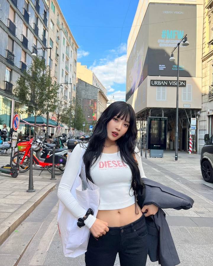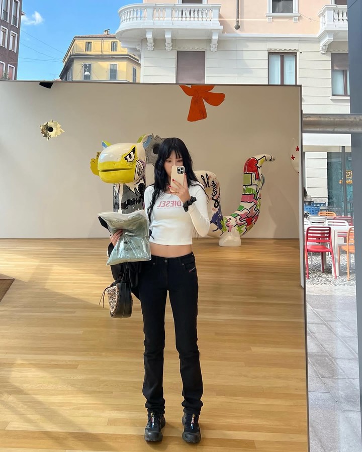 제니는 얇은 아이보리 롱슬리브와 블랙 슬림팬츠를 매치해 파리지앵 무드를 연출했고, 선글라스를 더한 내추럴한 룩으로도 변주했다. 조이는 화이트 롱슬리브에 ‘DIESEL’ 레터링의 크롭탑, 블랙 팬츠, 볼드한 목걸이와 헤어밴드로 유니크함을 완성했다.