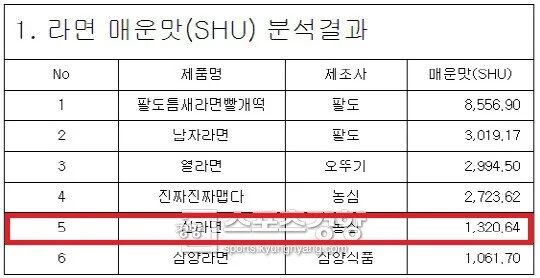 (현재 생산되는 진라면 매운맛보다 680 SHU 낮음)