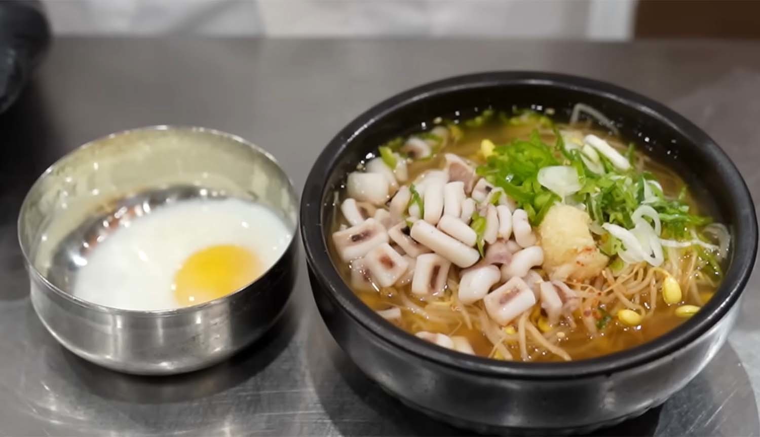 뜨거운 밥을 그릇에 깐다. 콩나물을 올리고, 오징어를 얹는다. 파와 고추를 썰어 넣고, 깨를 살짝 뿌린다. 국물을 300ml 정도 붓는다. 부장은 "이 상태로 먹어도 되고 뚝배기째 끓여 먹어도 된다. 맛이 다르다"고 했다. 끓이면 얼큰한 맛이 더 강해진다. 매운 걸 좋아하면 고춧가루를 추가해 끓인다. 유튜버는 "토렴을 하지 않아도 차이가 없다. 뜨거운 밥과 국물 그대로 먹으면 된다"고 말한다.
