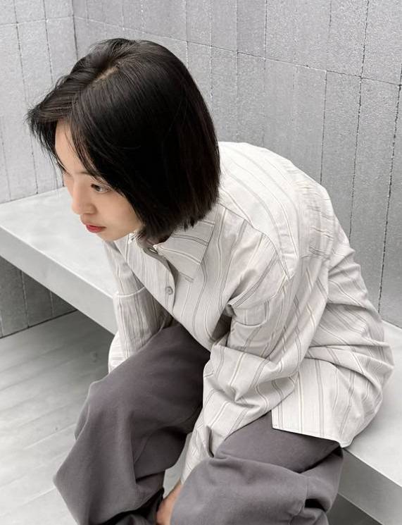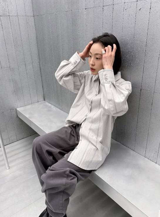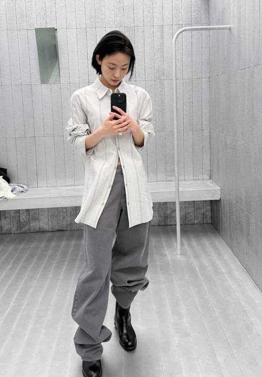 회색 스트라이프가 매력적인 셔츠를 반만 잠가 허리의 핏을 살렸어요. 여유롭게 떨어져 엉덩이를 가리는 것도 포인트.