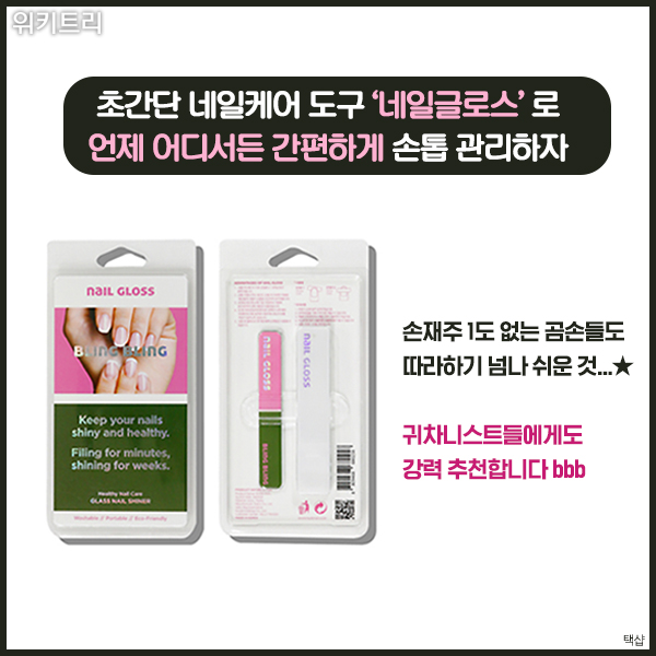 이런 고민을 덜어주는 제품이 바로 ‘네일글로스’다. 손톱 끝 정리, 표면 관리, 코팅까지 세 가지 기능을 한 번에 해결할 수 있어, 복잡한 과정을 거치지 않아도 깔끔한 셀프 네일 케어가 가능하다.
