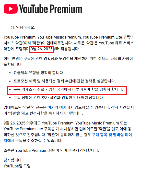 YouTube Premium 서비스 약관 업데이트 메일함 열어보면 다들 와있을탠데 이제 우회 절대 못하게 하겠다고 9월 26일부터 막겠다고함 ㄷㄷ 참고로 지들 우회는 아직도 잘하는중 ㅋㅋㅋ 한국은 전세계적으로 봐도 유튜브 프리미엄 가격이 완전 높은편 근데 가족요금제, 1년치 구독할인 서비스는 없음 ㅋㅋㅋㅋ 140억 벌었는데 어디쓸지 모르는 사람 후기송도 건설중인 기업 사옥들수면 부족 및 과로 했을때 주의할 점취업 안하는 딸 때문에 죽을 맛이라는 엄마명나라 황제도 못참고 칙서3통보낸 것
