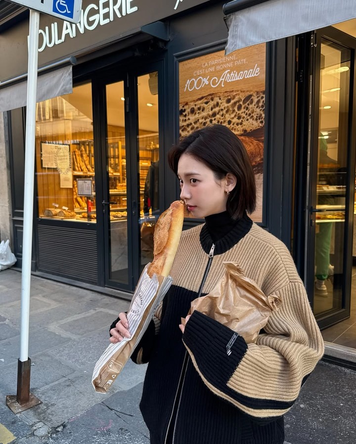 부드러운 컬러의 배색 집업 니트로 구성된 스타일은 여유로운 핏이 돋보였으며, 미니멀한 디자인에 니트 특유의 포근함과 경쾌한 배색 디테일로 세련된 가을 분위기를 풍겼다.