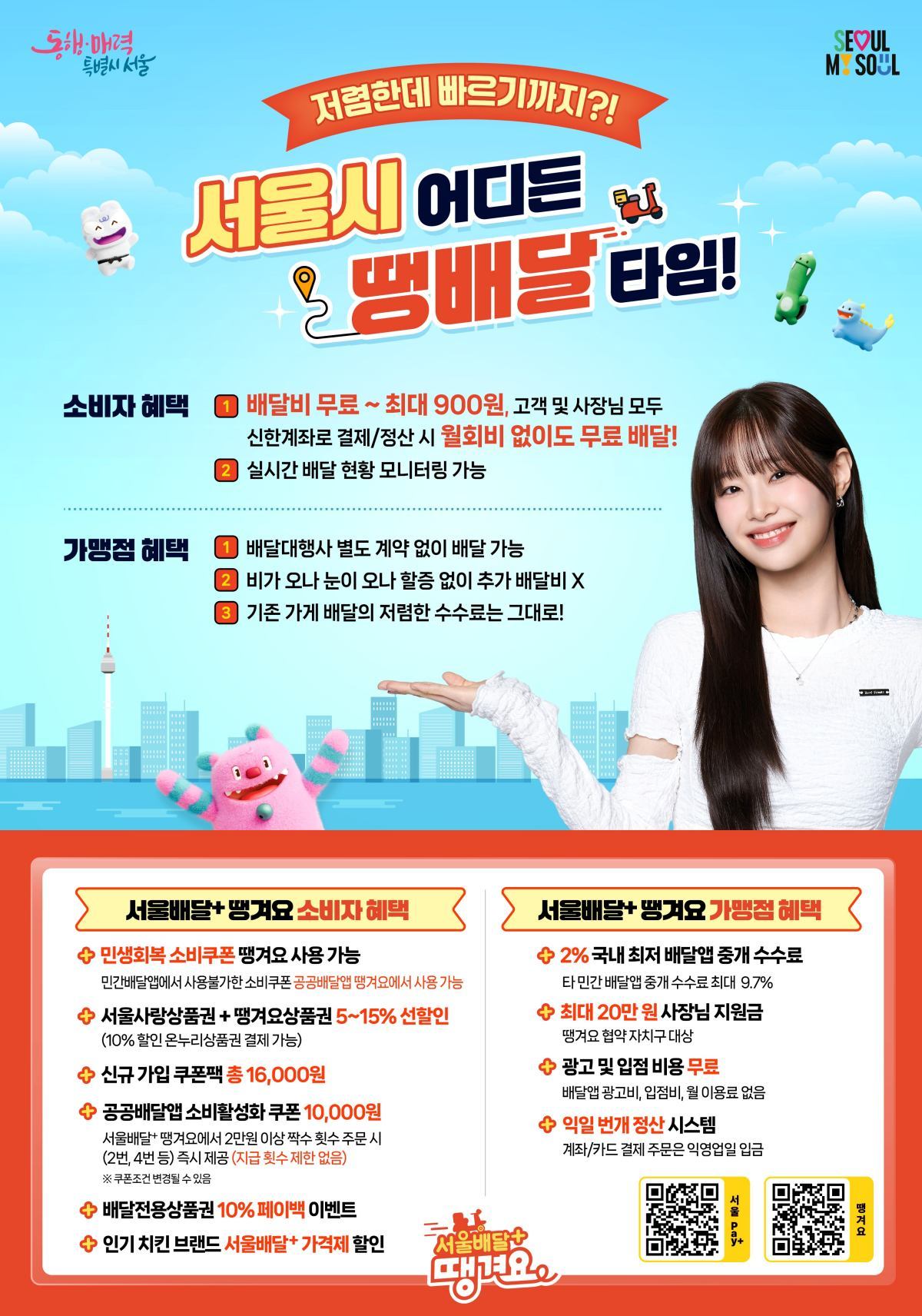 소비자 혜택은 눈에 띈다. 기본 배달비는 최대 900원이며, 가맹점 정산계좌와 결제계좌를 모두 신한은행으로 이용하면 배달비가 무료로 바뀐다. 또 서울시가 지급하는 민생회복 소비쿠폰을 비롯해 서울사랑상품권·땡겨요 상품권 5~15% 선할인, 신규가입 쿠폰 1만 600원, 공공배달앱 소비활성화 쿠폰 1만 원 등 다양한 할인과 프로모션을 동시에 적용할 수 있다.