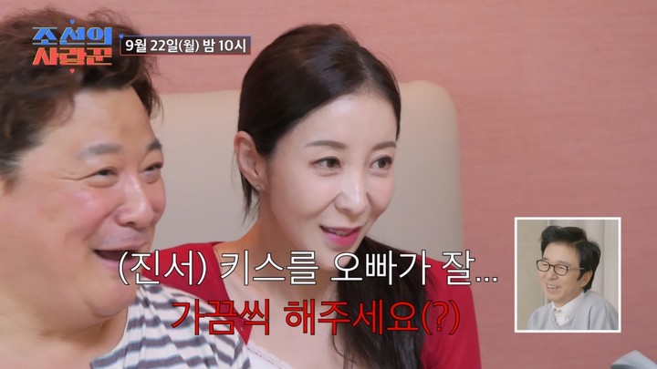 윤정수는 “키스는 밤에 해야 한다”며 자신의 생각을 밝혔고, 원진서는 “키스는 오빠가 가끔만 해준다”고 덧붙여 출연진에게 또 한 번 큰 웃음을 줬다.