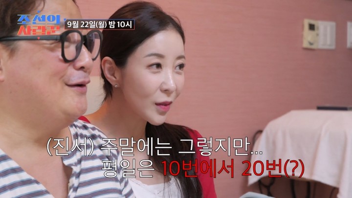 제작진의 질문에 ‘뽀뽀를 자주 하느냐’는 질문에 윤정수는 “뽀뽀는 큰 안정감을 준다. 50번이 넘을 때도 있다”고 답했다. 원진서는 “주말에는 그렇지만 평일에는 10~20번 정도 한다”고 부연했다.