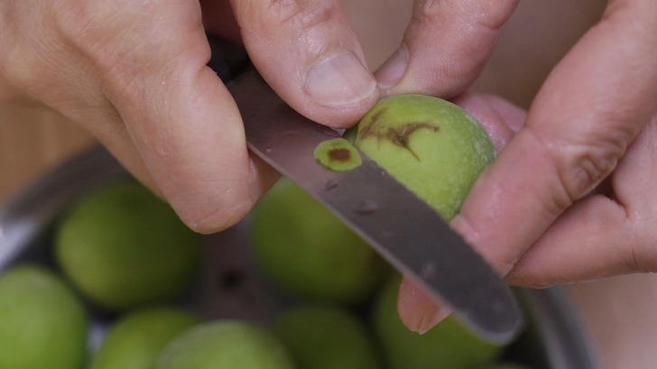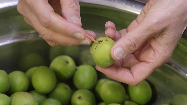 꼭지 부분은 이쑤시개를 이용해서 제거해 주세요. 이 부분은 쓴맛이 날 수 있어 미리 제거한 후 넣어야 해요. 만약 더러운 것이 묻었다면, 반드시 깨끗이 제거하고 매실청을 담궈야 해요.