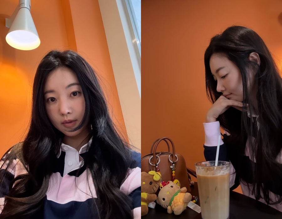 공개된 사진 속 김사랑 오렌지빛 벽을 배경으로 아이스 라테를 앞에 두고 앉아 있다. 긴 흑발 웨이브 헤어와 단정한 카라 티셔츠 차림이 어우러져 특유의 청순하고 단아한 매력을 배가시켰다.