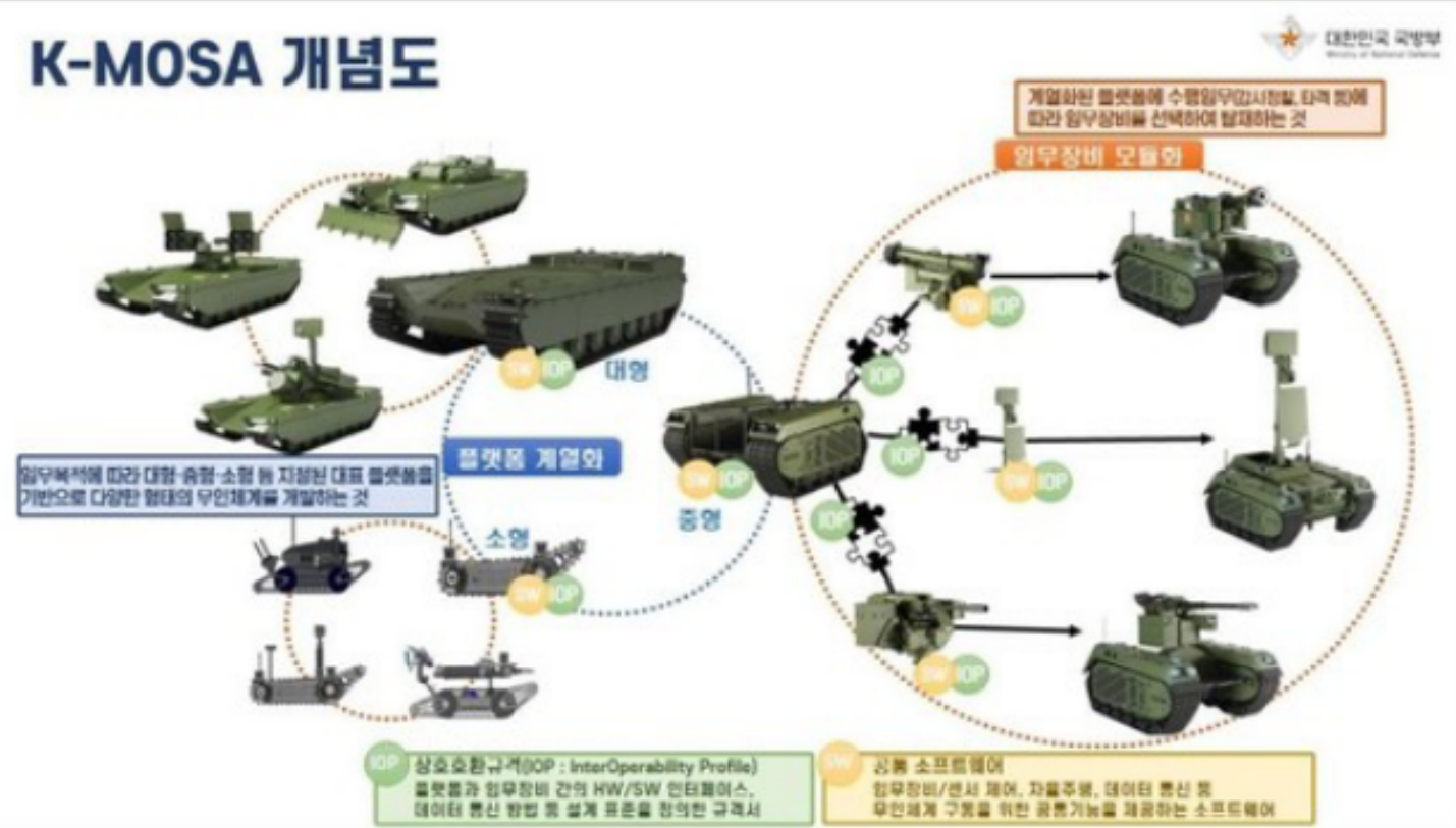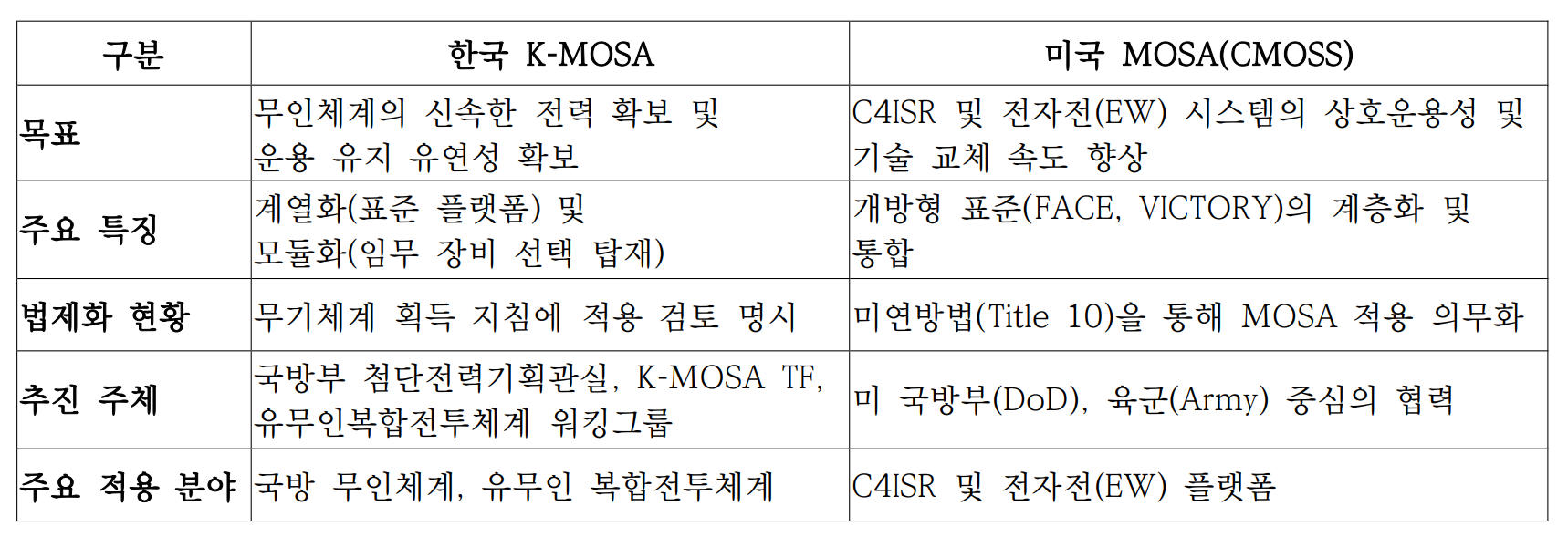 2. K-MOSA 개념 및 국방 정책 동향 2.1. MOSA 및 K-MOSA의 정의와 목적MOSA(Modular Open Systems Approach), 즉 모듈러 오픈 시스템 접근 방식은 방위 산업 및 군수 체계의 설계, 개발, 획득, 유지보수 전반에 걸쳐 유연성과 상호운용성을 극대화하기 위한 기술적·비즈니스적 전략이다. 이는 시스템을 모듈화하고, 개방형 표준에 기반한 구조로 설계함으로써, 장기적인 시스템 운용 및 개량 과정에서의 비용 절감, 업그레이드 용이성, 신속한 기술 적용을 가능하게 한다. MOSA는 특히 시스템의 라이프사이클 전반에 걸쳐 성능을 지속적으로 향상시키는 동시에, 상용 기술의 통합 및 다수 업체 간 기술 경쟁을 촉진하는 데에도 효과적이다. 한국 국방부는 이러한 MOSA의 개념을 국내 무기체계와 방산 환경에 맞게 재해석하여, 한국형 모듈러 오픈 시스템 아키텍처(K-MOSA: Korea-MOSA)를 제시하고 이를 전력화 전략의 핵심 축으로 삼고 있다. K-MOSA의 궁극적인 목표는 국방 무기체계의 유연성과 재사용성 확대, 운용 효율성 제고, 그리고 획득 비용 절감이라는 세 가지 방향으로 요약된다. K-MOSA는 특히 “계열화”와 “모듈화”를 핵심 전략으로 내세운다. 계열화란, 다양한 임무 환경과 작전 목적에 따라 대형, 중형, 소형 등의 기본 플랫폼을 설정하고, 이를 기준으로 다양한 유형의 무인체계 또는 무기 시스템을 공통 플랫폼 기반에서 개발·운용하는 방식을 의미한다. 이를 통해 플랫폼의 생산 효율성 및 정비 편의성을 높일 수 있다. 모듈화는 이러한 계열화된 플랫폼 위에 감시정찰, 전자전, 타격, 통신 중계 등 다양한 임무 기능을 수행할 수 있는 임무 모듈(Mission Module)을 선택적으로 탑재하거나 교체할 수 있도록 설계함으로써, 작전 환경과 위협 양상에 따라 신속한 임무 전환 및 기능 확장이 가능하도록 한다. K-MOSA는 단순히 기술적 표준화에 그치지 않고, 획득 전략, 산업 생태계의 개방성, 운용 유연성을 포괄하는 총체적인 방위 혁신 프레임워크로서 기능하고 있다. 이로써 군은 빠르게 변화하는 전장 환경에 능동적으로 대응할 수 있으며, 방위산업체는 기술 투자와 개발에 있어 보다 예측 가능하고 안정적인 구조 속에서 경쟁력을 확보할 수 있다. 2.2. MOSA 등장배경기존의 무기체계 개발 방식은 대개 특정 업체에 의존한 독점적 설계 구조로 이루어져 있었다. 이로 인해 시스템의 업그레이드 및 기술 갱신이 비효율적이고 비용 집약적이었으며, 새로운 기술을 적용하기 위해서는 전체 체계를 재설계하거나 대체해야 하는 구조적 한계가 있었다. 특히, 공급업체가 기술 사양을 독점하면서 정부와 군이 주도적으로 기술을 통제하거나 경쟁을 유도하기 어려운 구조가 고착되었다. 이러한 문제는 기술 변화 속도가 과거에 비해 압도적으로 빨라진 현대 전장 환경에서 더욱 심화되었다. 드론, 인공지능(AI), 사이버전, 우주기술 등 첨단 기술의 등장과 융합이 전장 양상을 근본적으로 변화시키면서, 기존 폐쇄형 무기체계는 신속한 기술 반영과 위협 대응에 취약한 구조로 전락하게 되었다. 이에 따라 미국을 포함한 주요 군사 강국들은 모듈화(Modularization)와 개방형 아키텍처(Open Architecture)를 중심으로 하는 신규 무기체계 설계 전략을 적극 채택하기 시작했다. 그 중에서도 미국은 2019년 국방수권법(NDAA: National Defense Authorization Act)을 통해 MOSA(Modular Open Systems Approach)의 적용을 의무화함으로써, 이를 국방 획득 정책의 핵심 원칙으로 공식 채택하였다. 이 법안에 따라, 미 국방부는 모든 신규 무기체계 획득 사업에서 MOSA를 기본 설계 원칙으로 적용해야 하며, 플랫폼 간 상호운용성 확보, 기술적 유연성 강화, 민간 기술 흡수 및 업체 간 경쟁 유도를 정책적으로 추구하게 되었다. 이러한 배경은 한국 국방부가 K-MOSA(Korean-MOSA)를 추진하게 된 전략적 기반이 되었으며, 국내 방위산업 역시 독립성과 지속가능성을 확보하기 위해서는 MOSA 개념의 수용이 불가피한 시점에 도달했음을 보여준다. 2.3. 미국 등 선진국의 MOSA 도입 사례 및 시사점미국은 이미 2019년 국방부 3군 각서에서 MOSA를 미래 무기 체계 개발 및 개량 사업에 최대한 사용할 것을 요구했으며, 2021년에는 미연방법 개정을 통해 MOSA 적용을 법적으로 의무화했다. 이는 MOSA가 단순한 기술적 요구 사항을 넘어, 국가의 국방 획득 및 운용 패러다임을 근본적으로 바꾸는 전략적 접근임을 시사한다. 대표적인 사례로 미 육군의 CMOSS(C4ISR/EW Modular Open Suite of Standards)가 있다. 이는 C4ISR(지휘통제, 통신, 컴퓨터, 정보, 감시, 정찰) 시스템의 복잡성과 성능 개량의 문제를 해결하기 위해 FACE, VICTORY와 같은 개방형 표준을 계층화하여 개발한 것이다. 이를 통해 하드웨어와 소프트웨어의 재사용성을 높이고, 네트워킹 및 상호운용성을 강화했다. 또한, 미 육군의 현대화 실험인 'Project Convergence'는 유무인 복합작전 능력을 극대화하기 위해 JADC2(통합합동전영역지휘통제)를 개발하고 있다. 이는 K-MOSA가 궁극적으로 지향하는 유무인복합전투체계 환경의 미래를 보여준다. 이러한 미국의 사례는 K-MOSA 정책이 성공적으로 정착하기 위해서는 기술 개발뿐만 아니라 명확한 적용 기준 및 절차 , 그리고 법적·제도적 뒷받침이 반