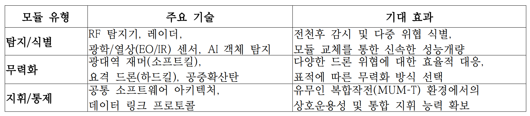 3. K-MOSA 기반 대드론 체계의 기술적 아키텍처 및 구성 방안 3.1. 대드론 체계의 모듈화 구성요소 분석K-MOSA 기반의 대드론 체계는 고속화되고 다변화된 드론 위협에 효과적으로 대응하기 위해, 모듈화(Modularization)와 개방형 아키텍처(Open Architecture)를 핵심 설계 원칙으로 채택해야 한다. 해당 체계는 크게 탐지/식별, 무력화, 지휘/통제의 세 가지 기능 모듈로 구성되며, 각 모듈은 표준화된 인터페이스를 통해 상호 교체 및 통합이 가능하도록 설계되어야 한다. 이러한 구조는 다양한 작전 환경에서 신속한 임무 전환 및 기능 확장을 가능케 하며, 유지보수 및 성능 개량 측면에서도 높은 유연성을 제공한다. [탐지/식별 모듈]RF 탐지기: 드론에서 방출되는 제어 신호, Wi-Fi, GPS 신호 등을 수신·분석하여 드론의 존재 여부를 탐지하고, 조기 경고 체계를 운용자에게 제공한다. 레이더: 물리적 드론의 위치 및 궤적을 탐지 및 추적하며, 저고도·저속 비행체에 최적화된 전술형 레이더 기술이 활용된다. 광학/열상(EO/IR) 센서: 고배율 줌 렌즈와 고감도 열화상 센서를 기반으로 주·야간 전천후 감시가 가능하다. AI 기반 객체 탐지 기술과 결합하여 드론뿐만 아니라 인원, 차량 등 다양한 위협을 식별할 수 있다.센서 모듈의 초경량화: 휴대용 또는 마이크로 드론에 부착 가능한 초경량 센서 모듈은 정찰용 무인체계와의 통합 운용을 가능케 하여 작전 확장성을 제공한다. [무력화 모듈]소프트킬(Soft Kill): 전자기파 재밍을 통해 드론의 통신 및 제어 신호를 방해하여 무력화하는 비운동성 방식이다. 광범위한 주파수(400MHz~6GHz)를 지원하는 광대역 멀티밴드 재밍 기능과 복잡한 도시 환경에서도 신뢰성을 유지할 수 있는 환경 적응성이 핵심 기술이다. 하드킬(Hard Kill): 드론을 물리적으로 파괴하는 운동성 방식이다. 레이저, 대공포, 미사일 등이 활용되며 '요격 드론'은 저렴한 가격으로 대량 생산된 적 드론을 효과적으로 요격할 수 있는 효율적인 수단이며, 공중확산탄을 이용한 요격 시스템도 개발 중이다. [지휘/통제 모듈]K-MOSA 기반 대드론 체계에서 지휘/통제 모듈은 탐지 및 무력화 기능을 유기적으로 연결하고, 전체 시스템의 상황 인식과 실시간 의사결정을 가능하게 하는 핵심 구성 요소이다. 이 모듈은 통합 소프트웨어 아키텍처를 기반으로 설계되며, 다중 센서와 무기 시스템, 유무인 전력 간의 상호 운용성을 보장하기 위해 표준화된 데이터 링크 프로토콜을 활용한다. 통합 상황 인식: 지휘/통제 모듈은 RF 탐지기, 레이더, EO/IR 센서 등 다양한 센서로부터 수집된 데이터를 통합 분석하여, 실시간 위협 지도를 생성한다. 이를 통해 운용자는 공간적, 시간적 위협의 패턴을 직관적으로 파악할 수 있으며, 작전 반응 속도가 향상된다. AI 기반 의사결정 지원: 고속으로 변화하는 전장 환경에서 지휘/통제 모듈은 단순 정보 전달 기능을 넘어, AI 기반 위협 분석 및 대응 우선순위 추천 기능을 통해 작전 지휘관의 의사결정을 지원한다. 예를 들어, 다수의 드론 위협이 동시 발생할 경우, 자동으로 요격 대상의 우선순위를 정하고, 최적의 무력화 수단을 제안할 수 있다. 확장성 및 상위 체계 연동: 지휘/통제 모듈은 향후 국방 지휘통제체계(C4I) 또는 통합전장관리체계(BMS)와의 연동을 고려하여, 계층적 명령 체계에 따라 유연하게 동작할 수 있어야 한다. 이를 통해 단일 부대 단위에서의 운용뿐 아니라, 연합작전 혹은 광역 방어 작전까지 확장 가능한 통제 구조를 제공한다. 운용 편의성과 경량화: 전장 환경에서의 실시간 운용을 고려하여, 지휘/통제 모듈은 휴대용 터치 디스플레이 기반의 UI/UX를 채택하거나, 차량·전술통제소에 탑재 가능한 형태로 경량화·모듈화 되어야 하며, 전술 상황 변화에 따른 신속한 배치·철수 및 재설정이 가능해야 한다. [아키텍처 정합성: MNDAF 및 UAF와의 연계 필요성]K-MOSA 기반 대드론 체계가 실효적 전력으로 기능하기 위해서는, 단순한 모듈화 수준을 넘어서 상위 작전·시스템·기술 계층과의 구조적 정합성이 확보되어야 한다. 이를 위해 국방부와 국방과학연구소(ADD)가 공동으로 추진 중인 MNDAF(Ministry of National Defense Architecture Framework) 및 UAF(Unified Architecture Framework) 기반의 MUM-T 공통 아키텍처 개념 연구 및 설계 프레임워크를 적극적으로 참조해야 한다. * MNDAF : 국방아키텍처프레임워크는 국방 정보화의 체계적 발전을 위해 대한민국 국방부가 정의한 표준화된 아키텍처 개발 방법론 및 지침 * UAF : 복잡한 시스템의 아키텍처를 표준화된 방식으로 기술하고 시각화하기 위한 프레임워크이 프레임워크는 작전운영 – 시스템/서비스 - 기술/표준화간 연계를 구조화함으로써, 복잡한 다계층 무기체계를 일관성 있게 설계·운용할 수 있도록 지원한다. 따라서 대드론 체계 역시 초기 설계 단계부터 MNDAF/UAF 구조를 준수하여 아키텍처를 정립하고, 정형화된 요구도·기능·데이터 흐름 모델을 통해 K-MOSA 표준과의 일치성 및 연동성을 확보하는 것이 바람직하다. 이는 후속 시스템 획득, 전력화, 업그레이드 단계에서도 체계적 정합성을 유지하는 기반이 될 수 있다. [전술적 유연성: 다계층 방어와 위협 기반 구성]K-