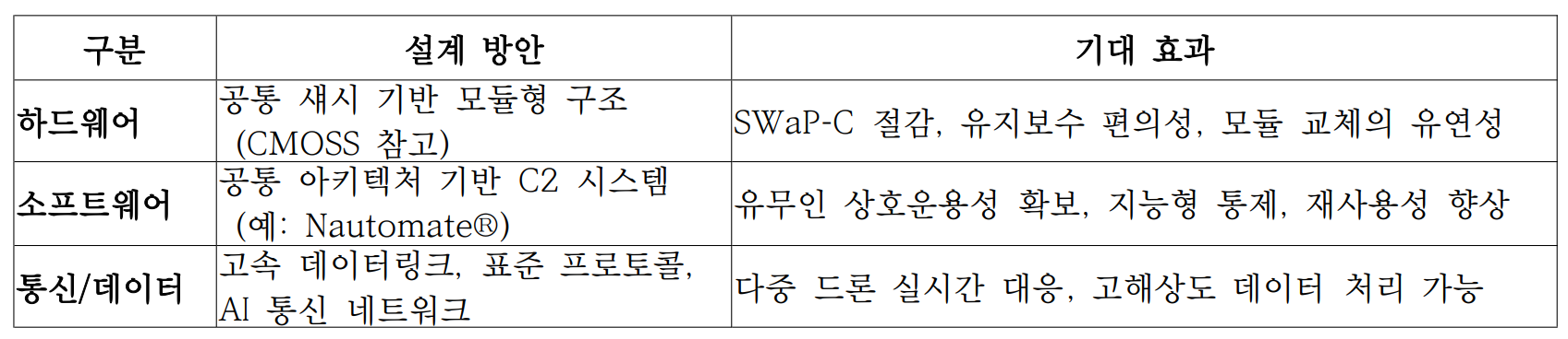 3.2. 공통 플랫폼 및 개방형 아키텍처 설계 방안K-MOSA 기반 대드론 체계의 실효성과 확장성을 확보하기 위해서는, 하드웨어와 소프트웨어 전반에 걸친 개방형 아키텍처(Open Architecture) 적용이 필수적이다. 이를 통해 시스템 간 상호 운용성을 높이고, 기술 변화에 대한 민첩한 대응은 물론, 유지보수 및 성능 개량 비용의 절감이라는 전략적 이점을 동시에 확보할 수 있다. [하드웨어 측면: 공통 섀시 기반 모듈화 설계]하드웨어 구성에서는 미 육군의 CMOSS(Communications Modular Open Suite of Standards) 사례를 참고하여, 공통 섀시 내에 다양한 기능의 모듈형 카드를 장착하는 방식의 표준화 설계를 도입할 수 있다. 이는 센서, 재머, 통신, 제어 등 다양한 기능을 갖는 모듈을 동일한 플랫폼 구조 내에서 유연하게 교체 및 추가할 수 있도록 하여, 기술 통합 속도를 획기적으로 향상시킨다. 이러한 접근 방식은 SWaP-C(크기 Size, 무게 Weight, 전력 Power, 비용 Cost) 요소를 최소화하고, 운용 효율성과 다기능 통합 능력을 강화한다. 예를 들어, 하나의 섀시 기반 공통 플랫폼에 EO/IR 센서 모듈과 재밍 카드, 통신 릴레이 모듈을 상황에 따라 결합하여 다양한 작전환경에 적합한 맞춤형 대드론 체계를 빠르게 구성할 수 있다. [소프트웨어 측면: 공통 소프트웨어 아키텍처와 데이터 연동]소프트웨어 구조는 공통 소프트웨어 아키텍처(Common Software Architecture)를 중심으로 설계되어야 하며, 이는 유무인 복합체계 간 상호운용성 확보, AI 기반 자동 판단 기능 통합, 소프트웨어 재사용성 극대화 등을 가능케 하는 핵심 기반이 된다. 대표적 사례로는 BAE Systems의 Nautomate® 플랫폼이 있다. 이 시스템은 공통 지휘통제(C2) 소프트웨어를 활용하여 유무인 플랫폼 간의 작전 통제 통합을 실현하고 있으며, 모듈 간의 원활한 데이터 교환과 플랫폼 간 역할 분담 자동화를 가능케 한다. 이러한 모델은 K-MOSA 기반 대드론 체계에도 유사하게 적용 가능하며, 특히 센서 융합, 타겟 우선순위 판단, 무력화 수단 선택 등 복합적인 판단이 필요한 상황에서 지능형 의사결정 시스템의 기반이 된다. [고속 데이터 전송 및 통신 표준화]대드론 체계의 효과적 운용을 위해서는 다수의 센서-지휘소 간의 대용량 실시간 데이터 전송이 핵심이다. 이를 위해 고속 데이터링크 기술, 저지연·고신뢰 통신 체계, 다중 노드 간 네트워크 연결성을 보장하는 표준 통신 프로토콜이 필요하다. 특히, 저고도에서 빠르게 이동하는 드론을 추적하고 다중 표적에 동시 대응하기 위해서는 멀티 채널 데이터 융합 처리 능력이 필수적이며, 이를 위해 전술 데이터링크 또는 AI 기반 메시 네트워크 구조 도입이 고려될 수 있다. 표 3, 공통 플랫폼 및 개방형 아키텍처 설계의 기대 효과