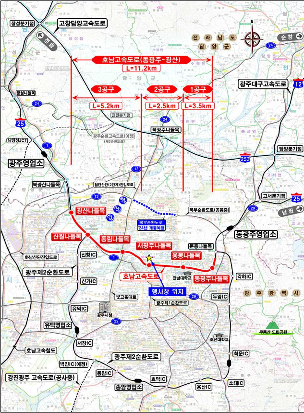 광주광역시는 지난 22일 국립광주박물관 주차장에서 기공식을 열고 '호남고속도로 동광주IC~광산IC 구간 확장사업'에 본격 착수한다고 밝혔다. 이 구간은 1986년 4차로로 확장된 이후 25년 넘게 추가 개선이 없었던 곳이다. 그동안 교통량 폭증에도 불구하고 구조 개선이 지연되면서 시민 불편이 극심했다.
