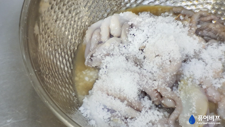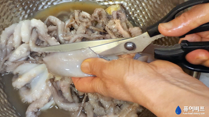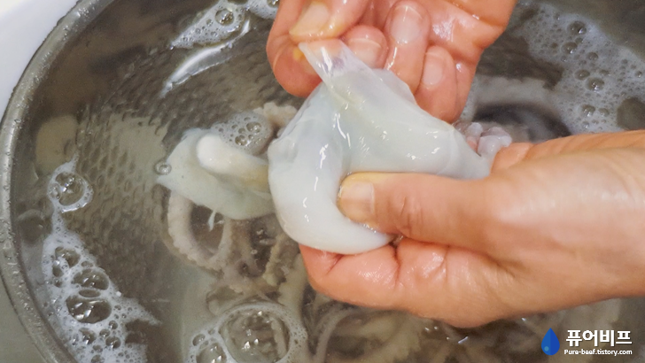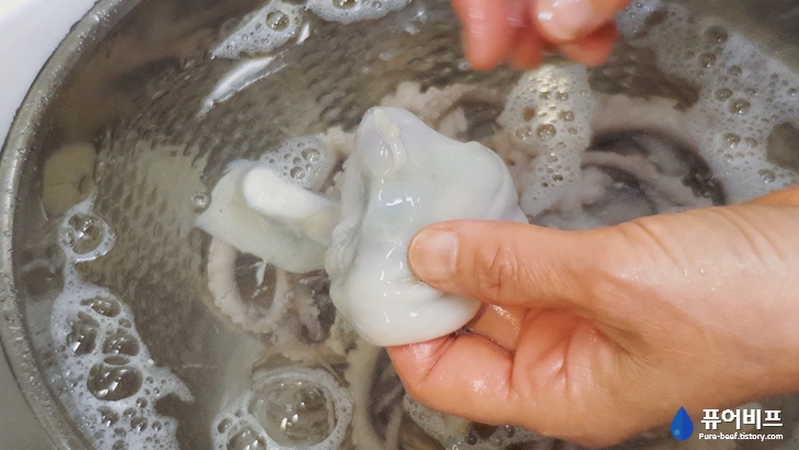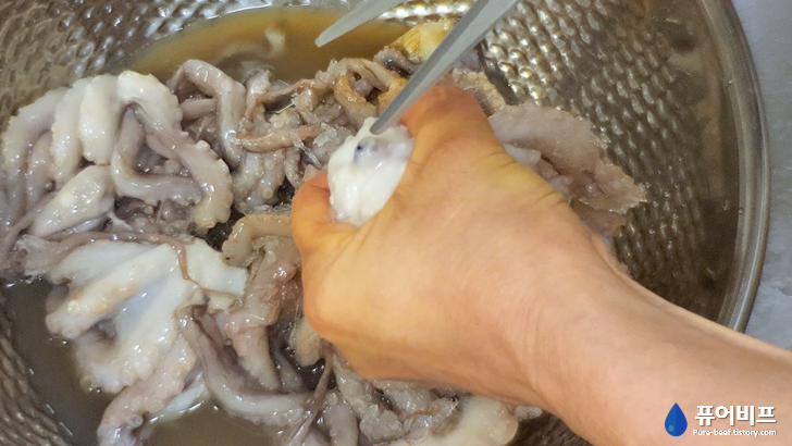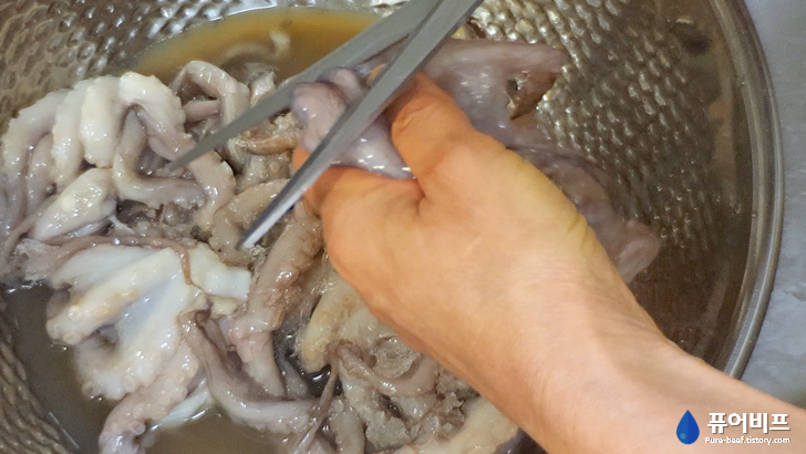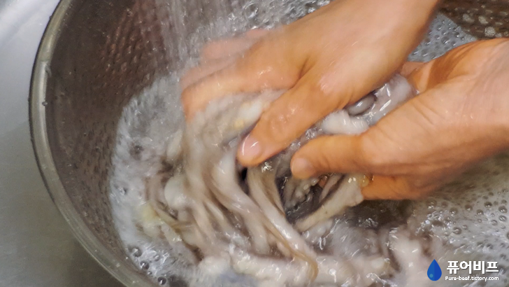 소금으로 문지른 낙지는 물에 여러 번 문질러가면서 깨끗하게 씻어 주셔야 해요.