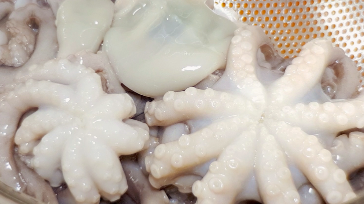 눈과 이빨을 제거해 주세요. 낙지를 보시면 검정색 2개가 눈인데 눈을 제거한 후