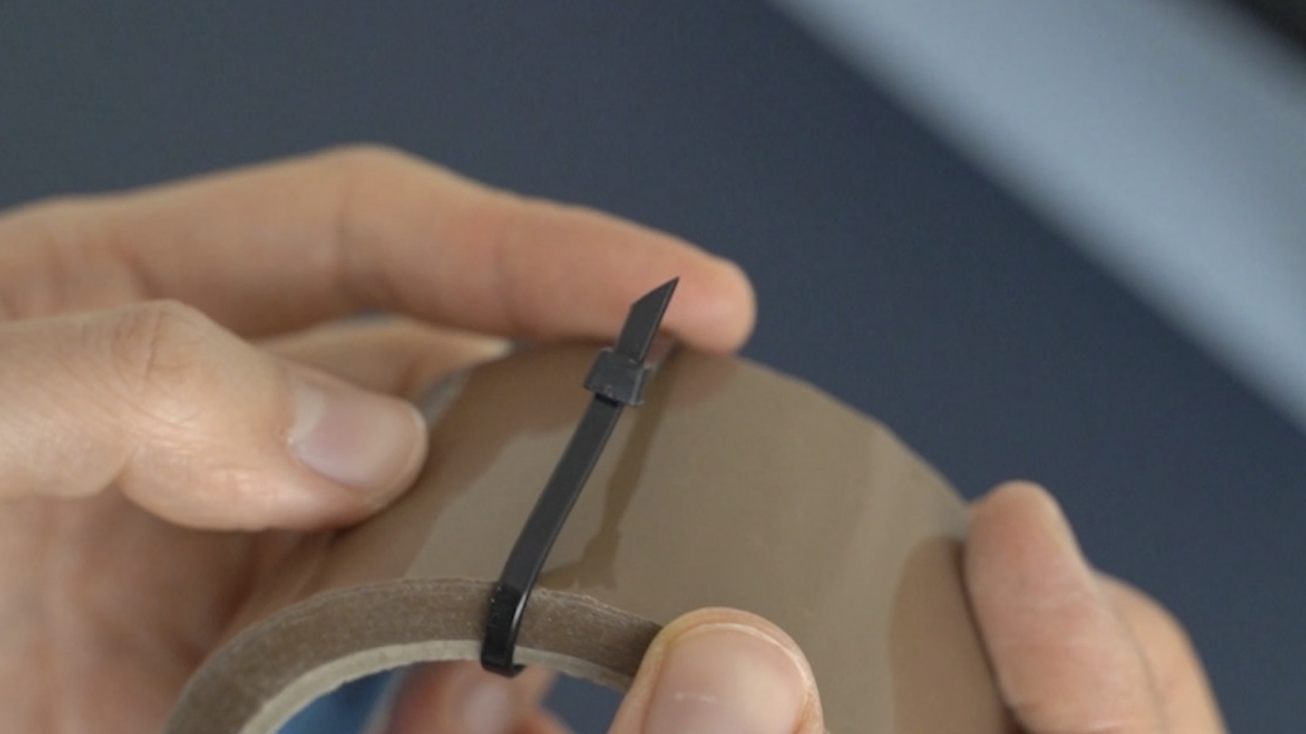 박스테이프를 사용할 때 가장 불편한 점을 꼽으라면 당연히 커팅이에요. 가위나 칼이 있어야 테이프를 자르기 쉬운데요. 이제는 케이블타이 하나를 테이프에 잘 묶어 두세요. 그리고 끝 부분이 날카롭게 가위로 사진과 같이 잘라 줍니다.