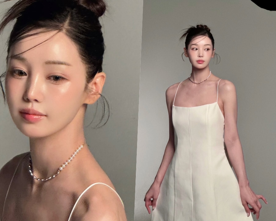 해당 사진 속에는 한 매거진 화보 촬영에 임하고 있는 남규리의 모습이다. 슬립 스타일의 얇은 어깨 끈과 깔끔한 실루엣은 남규리의 날씬한 보디라인을 한층 더 돋보이게 했고, 진주 목걸이를 매치해 고급스러운 무드를 완성했다. 자연스러운 올림머리와 은은한 메이크업은 동안 미모를 강조하며 청순하면서도 세련된 매력을 동시에 자아냈다.