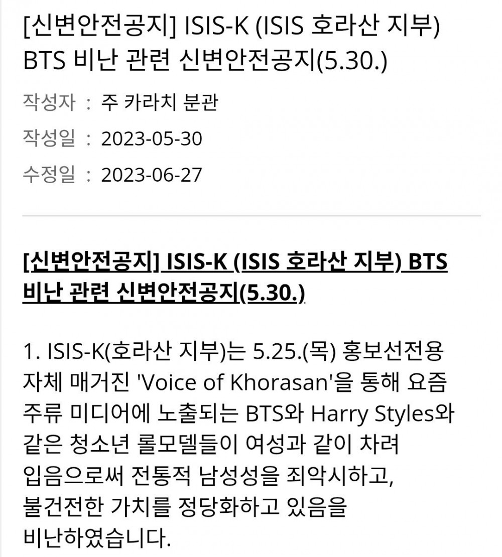 2025.9.24ISIS-K (코로산 지부 • 파키스탄 및 아프가니스탄)가 선전 미디어 센터에 사진을 개시하며 테러 가능성을 예고하였음. 특히 2년전 이들은 BTS를 비난하였고 한국인에 대한 표적 테러 가능성이 높아져 대사관에서 교민을 상대로 신변에 유의할 것을 공지하기도 하였음.미디어 선전에 능한 이들의 특성상 추후 테러 발생시 성명문과 선전물 또한 개시될 것으로 예상됨. 그들의 주무대는 아프가니스탄과 파키스탄이지만 중앙아시아와 러시아 또한 활동범위에 있음.혹시 해당지역의 교민이 있다면 안전하시길 바랍니다.