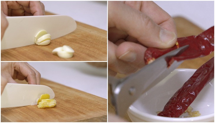 마늘과 생강은 편썰어 주시고, 마른청양고추는 가위로 가운데를 한번 잘라 주세요.