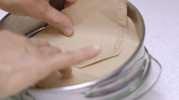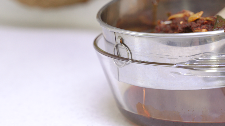 3분이 지나면 고추 기름을 필터에 부어 주세요.