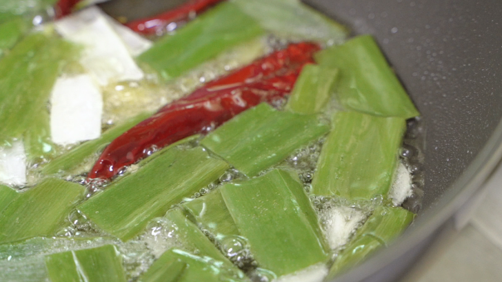 파 초록 부분에는 진액이 있어서 손가락으로 진액을 뺀 후 사용해야 기름에 튀지 않아요.