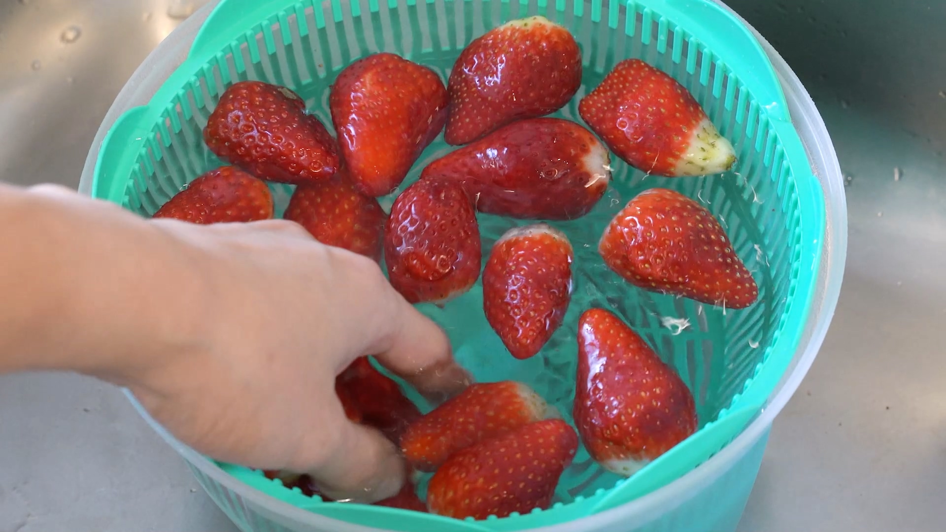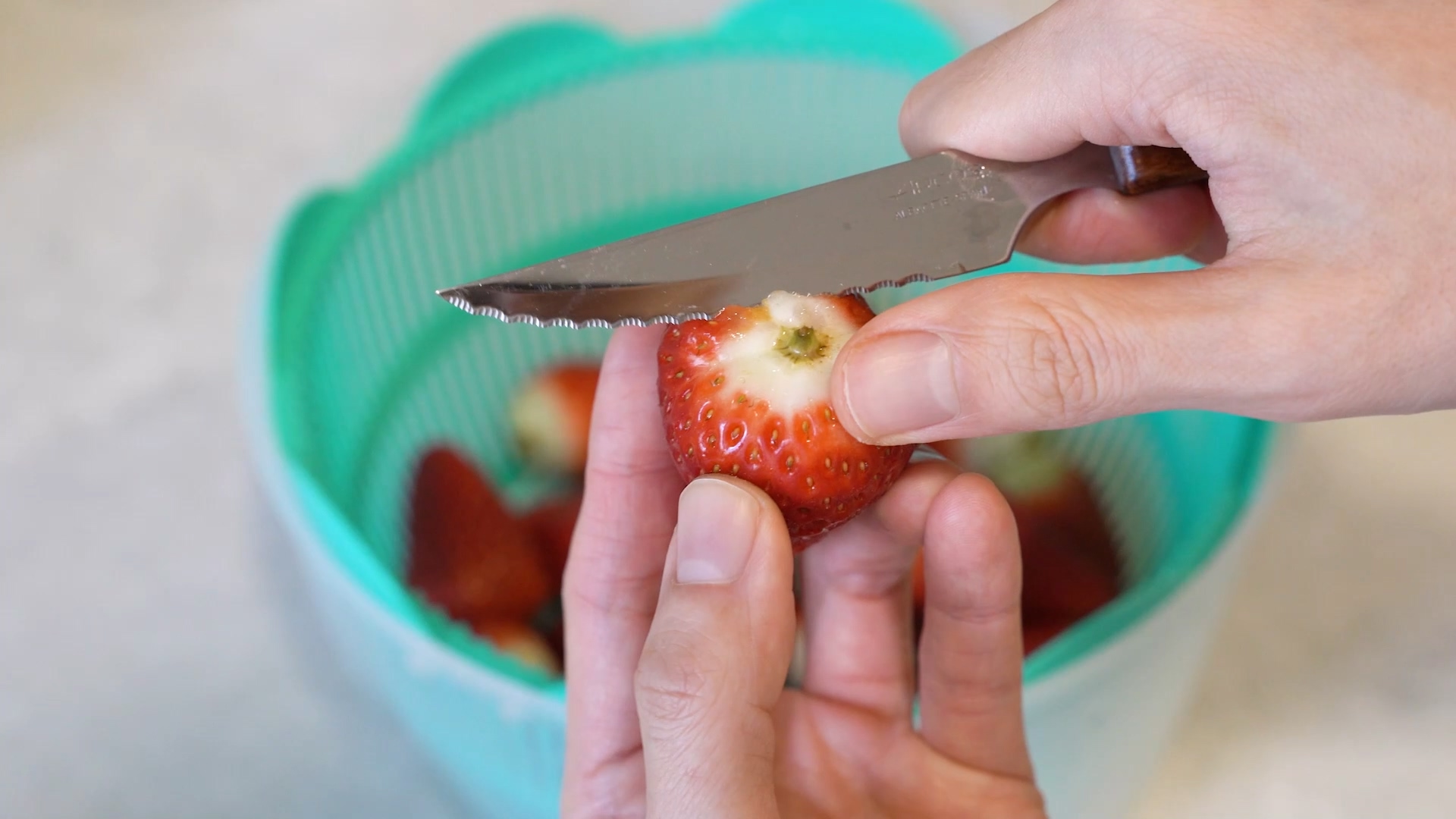 씻은 딸기는 꼭지 부분을 잘 정리합니다. 정리를 안해 주면 씹힐 때 맛이 없어요.