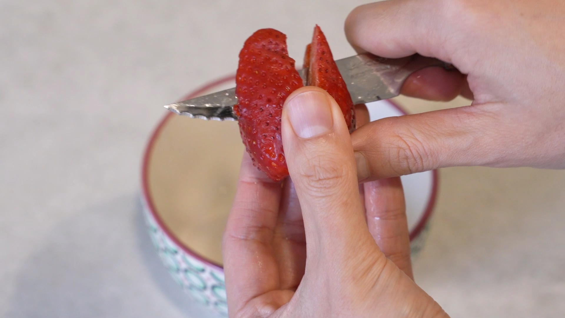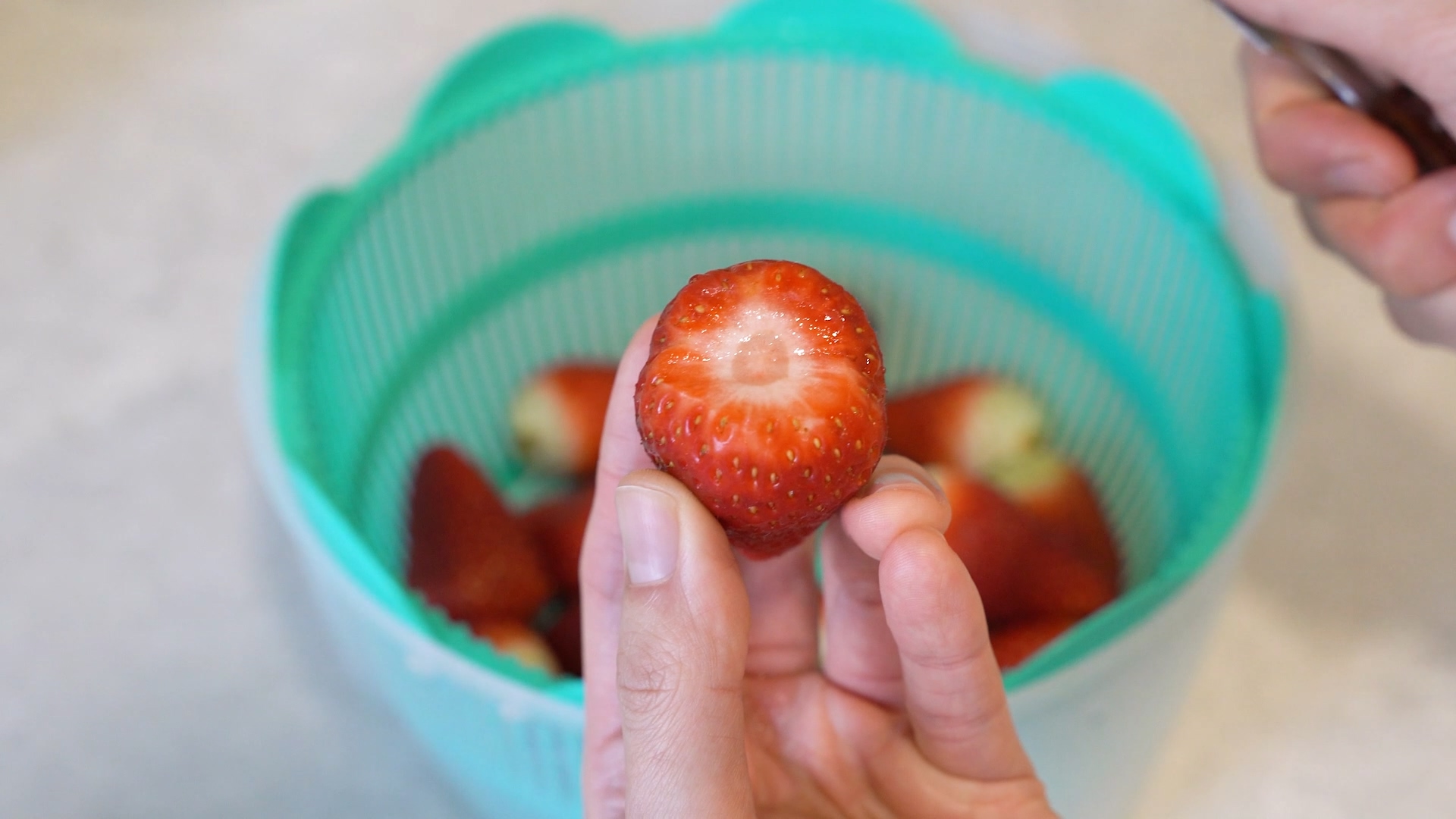 이제 딸기를 칼로 4등분 하고 손가락 한마디 보다 조금 작은 크기로 썰어 주세요. 너무 작은 크기로 썰면 먹을 때 씹히는 맛이 없어요. 그래서 약간 커야 씹히는 맛이 좋답니다.