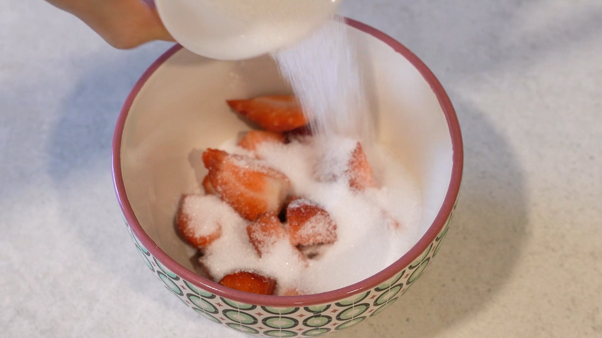 잘라 놓은 딸기는 전자레인지 용기에 넣으세요. 이때 용기의 크기는 내용물 보다 5배 이상 큰 것으로 준비해야 넘치지 않아요. 여기에 설탕 50g을 함께 넣으세요. 만약 더 많은 양을 만드신다면 딸기 2 : 설탕 1 비율로 섞어 주세요.