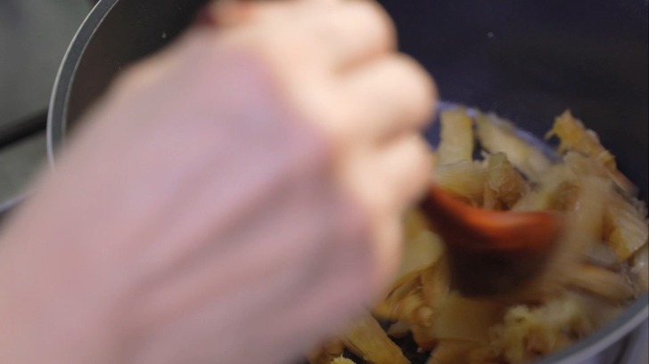 먼저 냄비에 ‘중불’에서 참기름을 넣고 황태채를 넣고 볶아 주세요.