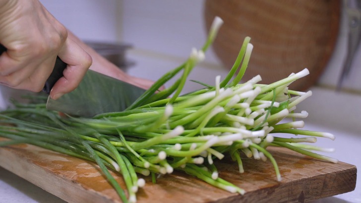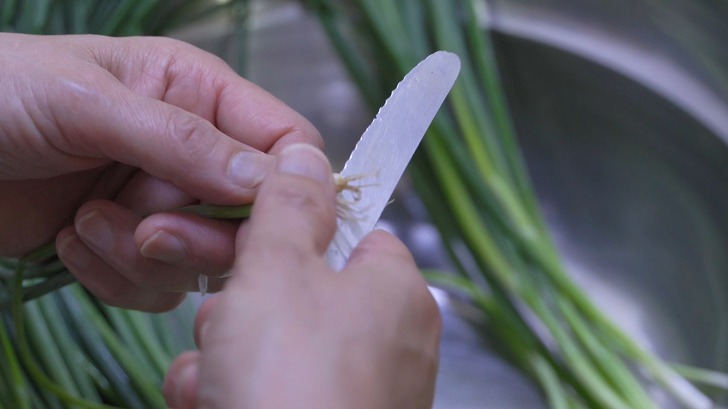 먼저 실파 뿌리 부분을 자르고 끝 부분을 다듬어 주세요.