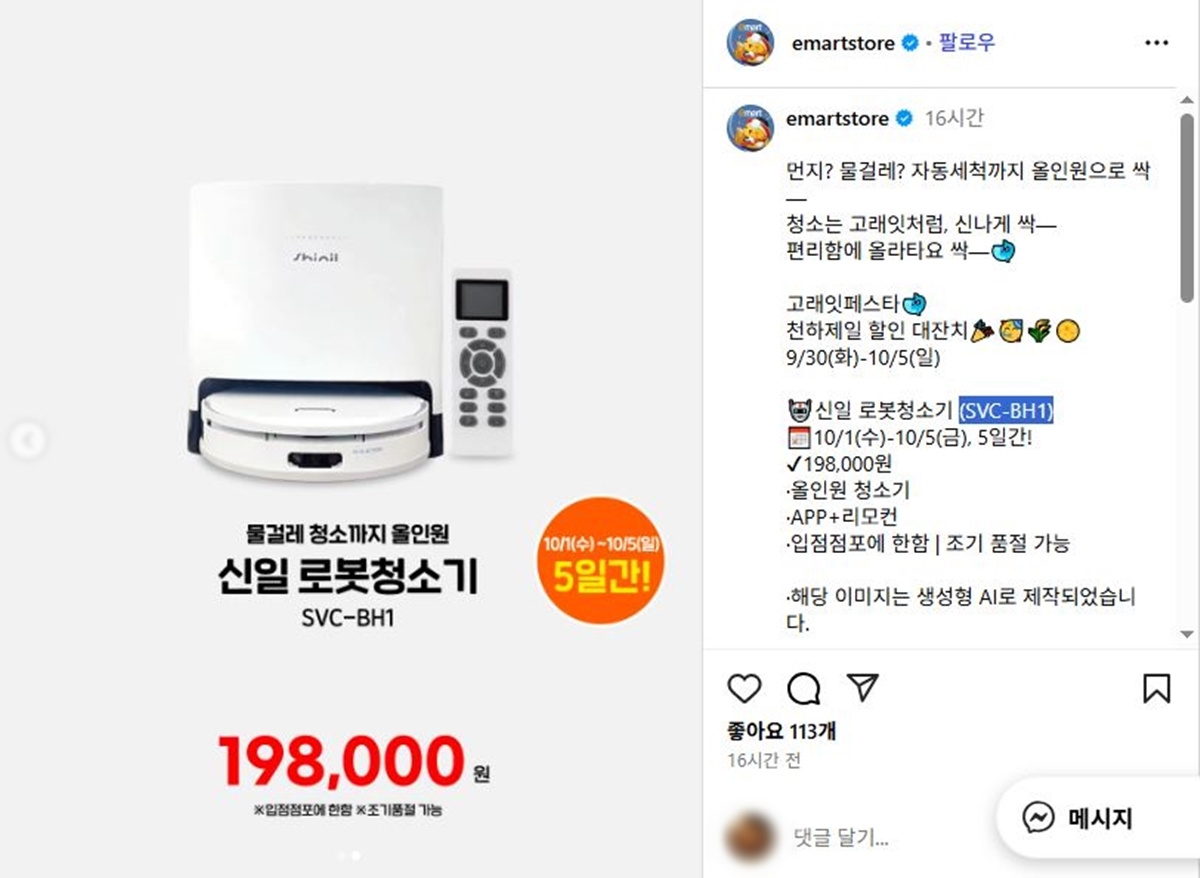 이마트가 특가 행사를 통해 판매하는 국산 '올인원 로봇청소기'가 화제가 되고 있다. 10만 원대라는 깜짝 놀랄 파격 가격이 공개돼 소비자들의 이목이 집중됐다.