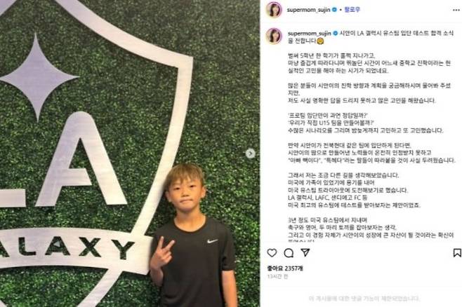 이동국의 아내 이수진은 자신의 SNS를 통해 “전북 현대보다도 입단이 어렵다는 LA 갤럭시 유스팀 디렉터로부터 시안이와 함께하고 싶다는 말과 함께 합격 통보를 받았다”라고 전했는데요.