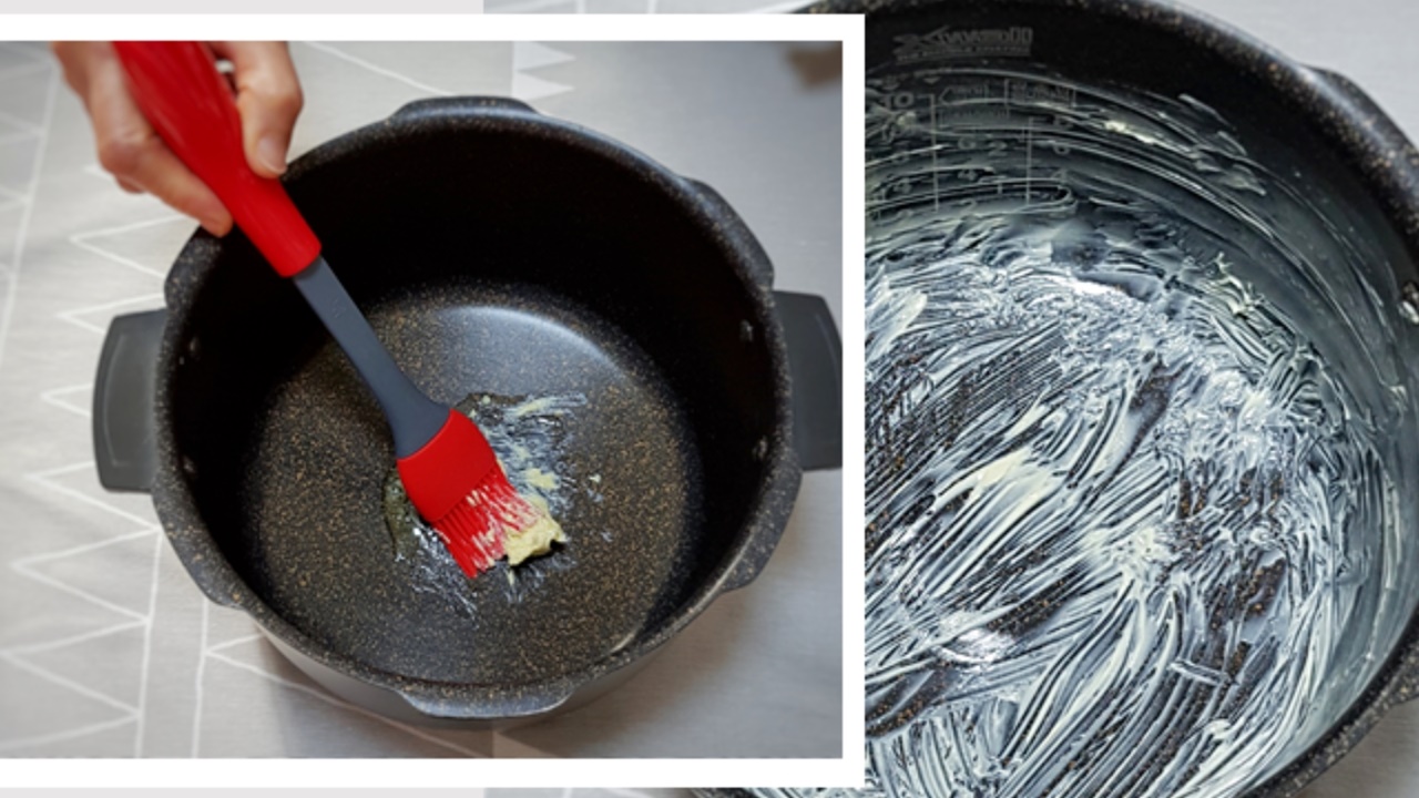 전기밥솥을 준비한 후 버터 조금을 넣고 주변부에 모두 발라 주세요. 그래야 카스테라가 들러붙지 않고 예쁜 모양으로 나오게 된답니다. 그리고 버터의 고소함이 더해져 더욱 맛있어요.
