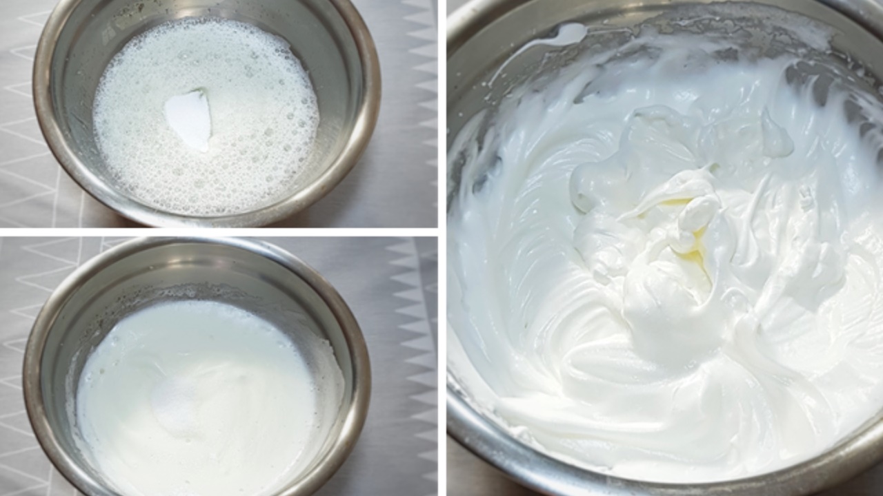 설탕을 계속 나눠가며 휘핑기구로 계속 저어가며 머랭을 만들어 주세요. 머랭의 농도는 쫀득쫀득한 느낌이 들 때까지 저어주셔야 해요. 휘핑기구를 들어 올렸을 때 ‘원뿔 모양’이 만들어 지면 완성이랍니다.