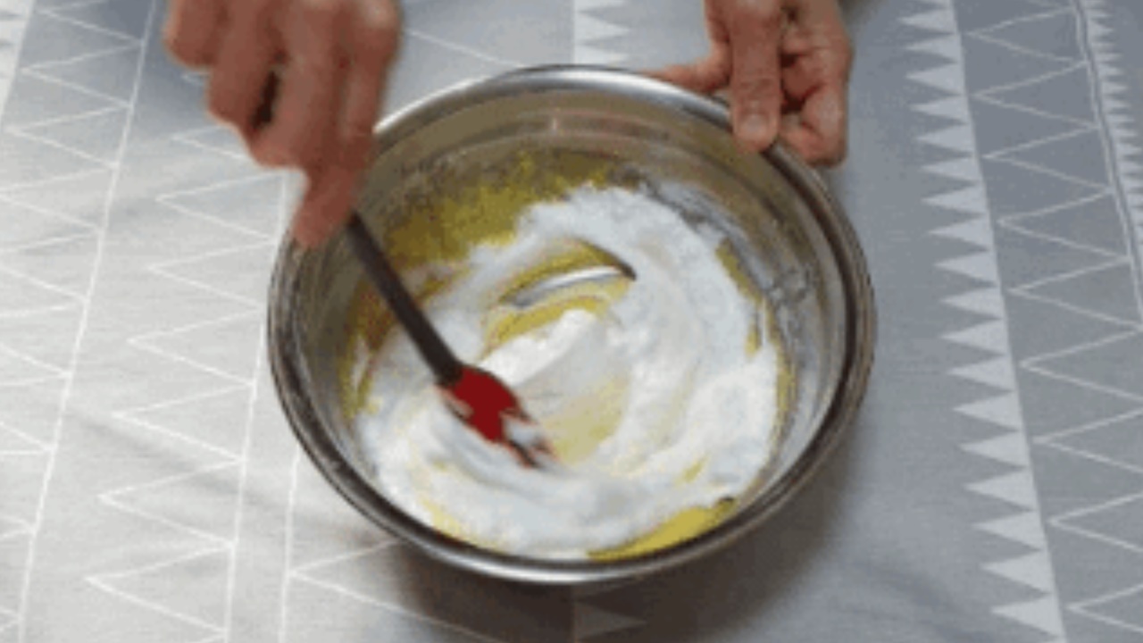 잘 섞은 노른자와 밀가루에 머랭을 넣고 잘 섞어 놓으세요.