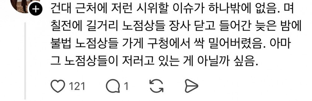 저기 교통량엄청 높은데 한가운데 누워있음 아마 며칠 전에 노점상 싹다 밀어버렸는데 그 시위로 추측됨 한국에 온 네팔 소년들이 돈까스를 허겁지겁 먹은 이유경남고 두번째 우승.. 이대호 회식 금액 ㄷㄷ뚱뚱한 사람들이 살빼기 힘든 이유손예진 누님 언더웨이 화보평양에 새로 생긴 고급카페 ‘미래 리저브‘