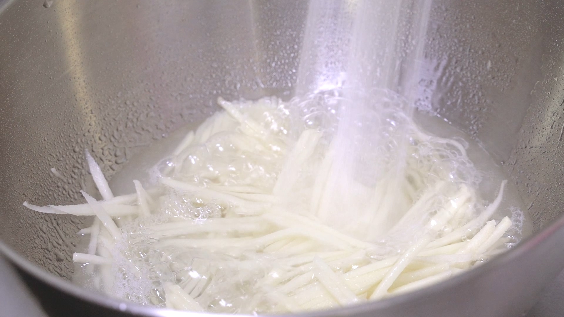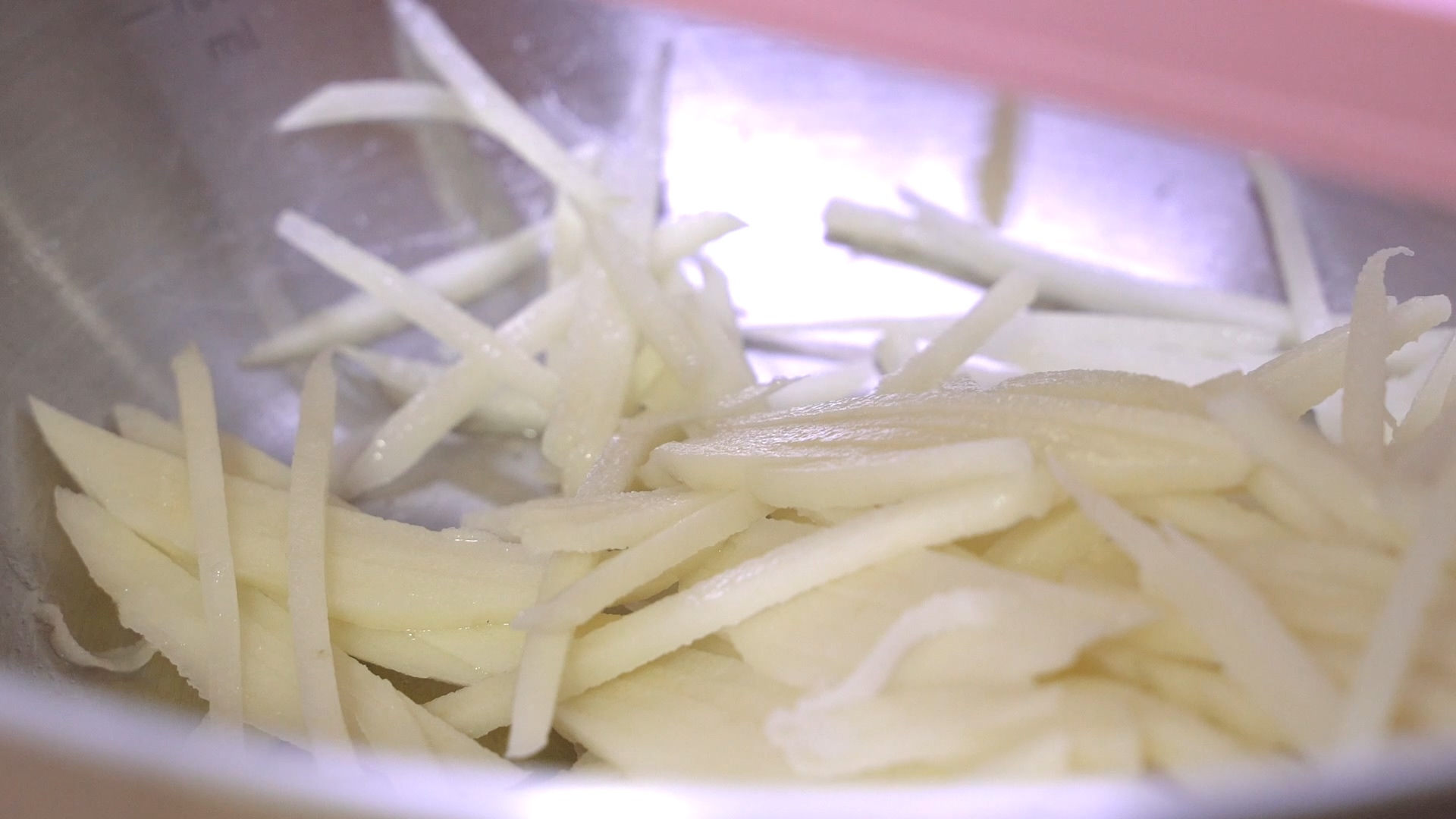 채썰은 감자는 물에 한번 씻어 주세요. 이 과정을 거치고나면 전분기가 제거 된답니다.